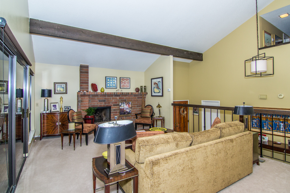 The next level includes the living room, dining room, and kitchen, with access to the yard from both the kitchen and the living room. Also in the living room is the fireplace and wonderful vaulted ceilings where you can view the upper floors.