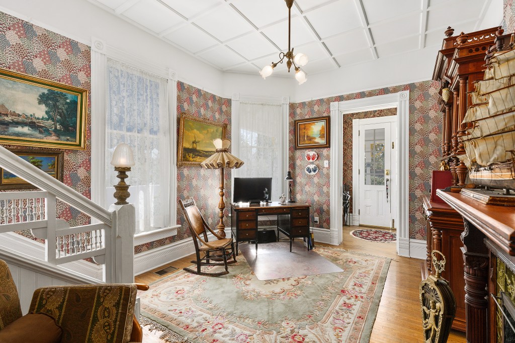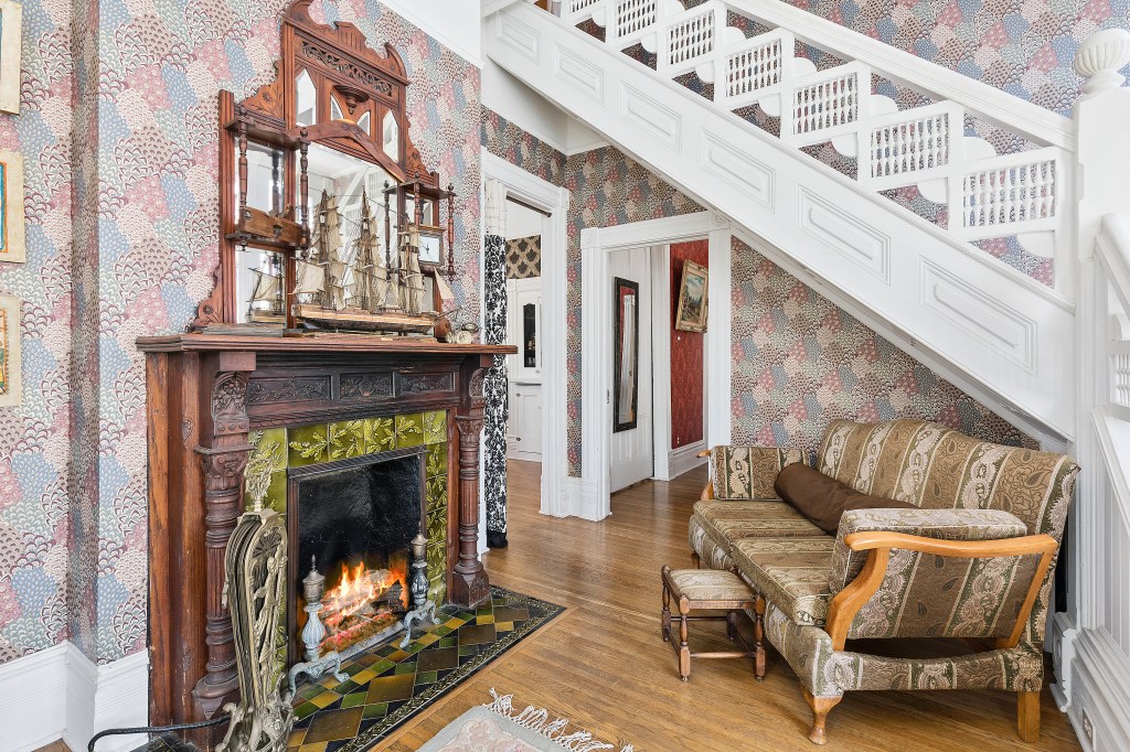 Upon entering the home, you will be presented with true Victorian style and décor. The high ceilings and prominent baseboards, together with white oak hardwood floors and multiple pocket doors dividing each room are all features that have not changed over time. Even the pocket doors’ push button hardware has been painstakingly restored so that each set of doors works perfectly. Looking up, you’ll notice several original Edison light fixtures, (converted to electric, of course) as well as period balustrade work on the staircase. Multiple fireplaces in the home feature incredibly detailed surrounds which incorporate custom glazed tile and detailed carved wood mantels. The downstairs fireplaces have been converted to gas for convenience of use.
