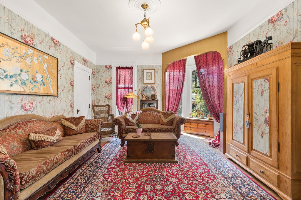Original interior features abound, including ceramic tiles, balustrade work on the staircase, multiple pocket doors, and hardwood flooring.