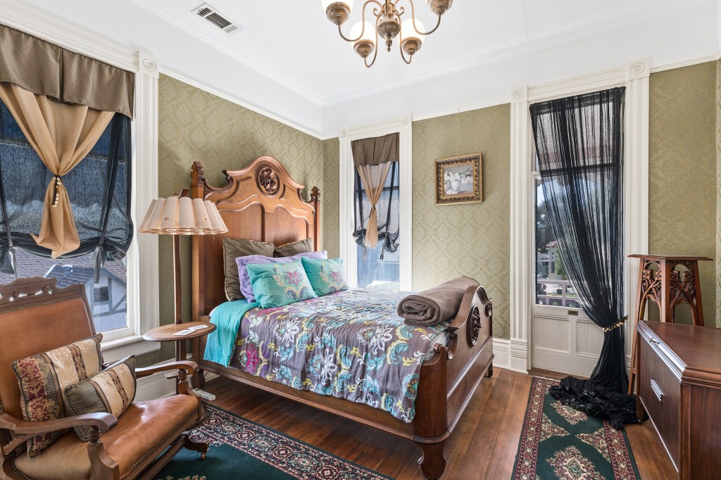 In the heart of this historic district the Magee House stands proud as a lovely reminder of days gone by. Since purchasing it in 2007, the current owners have taken care to lovingly restore every inch of this beautiful home. Over the years they have found period hardware, wallpaper, fixtures, and paint colors to bring this lovely Queen Ann back to its original glory. As you approach the home, take a moment to appreciate the intricate spindle work, and design detail of the home’s exterior from the ship wheel corner brackets on the front porch to the rising sun above the second story balcony.